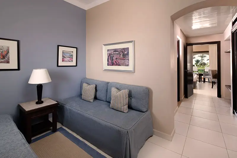 Wählen Sie Superior Family Rooms (ca. 45 m², FZX1-Kategorie) mit Poolblick – ideal für Familien mit Queen-Size-Bett im separaten Schlafzimmer, Wohnbereich und Balkon; priorisieren Sie Zimmer in den oberen Etagen (z. B. Block 2, Etage 2-3, Nummern ab 200er-Serie) für minimale Lärmbelastung und besten Ausblick auf Pools und Meer.