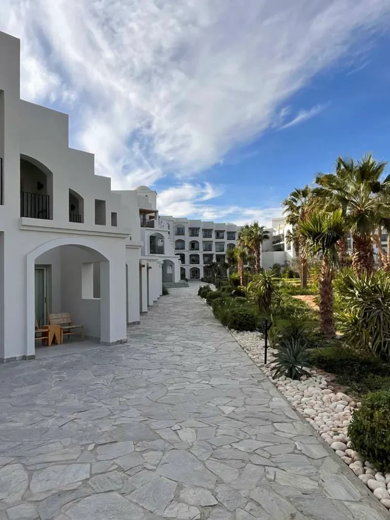 Die Architektur des Hotels verbindet moderne, minimalistische Designprinzipien mit lokalen, traditionellen Elementen. Die Gebäude wurden mit offenen und hellen Fassaden gestaltet, die den Gästen einen ungestörten Blick auf die umliegende Landschaft und das Meer ermöglichen. Das 2023 eröffnete Hotel nutzt viel Naturstein, Holz und Metall, was eine warme, aber zugleich elegante Atmosphäre schafft.
